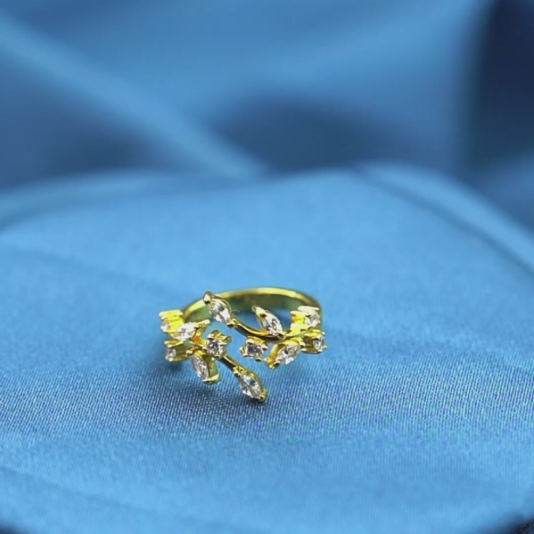 Inspired by nature, this 925 sterling silver ring with 18k gold plating features delicate vine-like branches adorned with marquise-cut and round cubic zirconia stones. Its lightweight, adjustable, and tarnish-resistant design makes it perfect for everyday wear or stacking. A must-have for lovers of nature-inspired, statement, and adjustable rings!