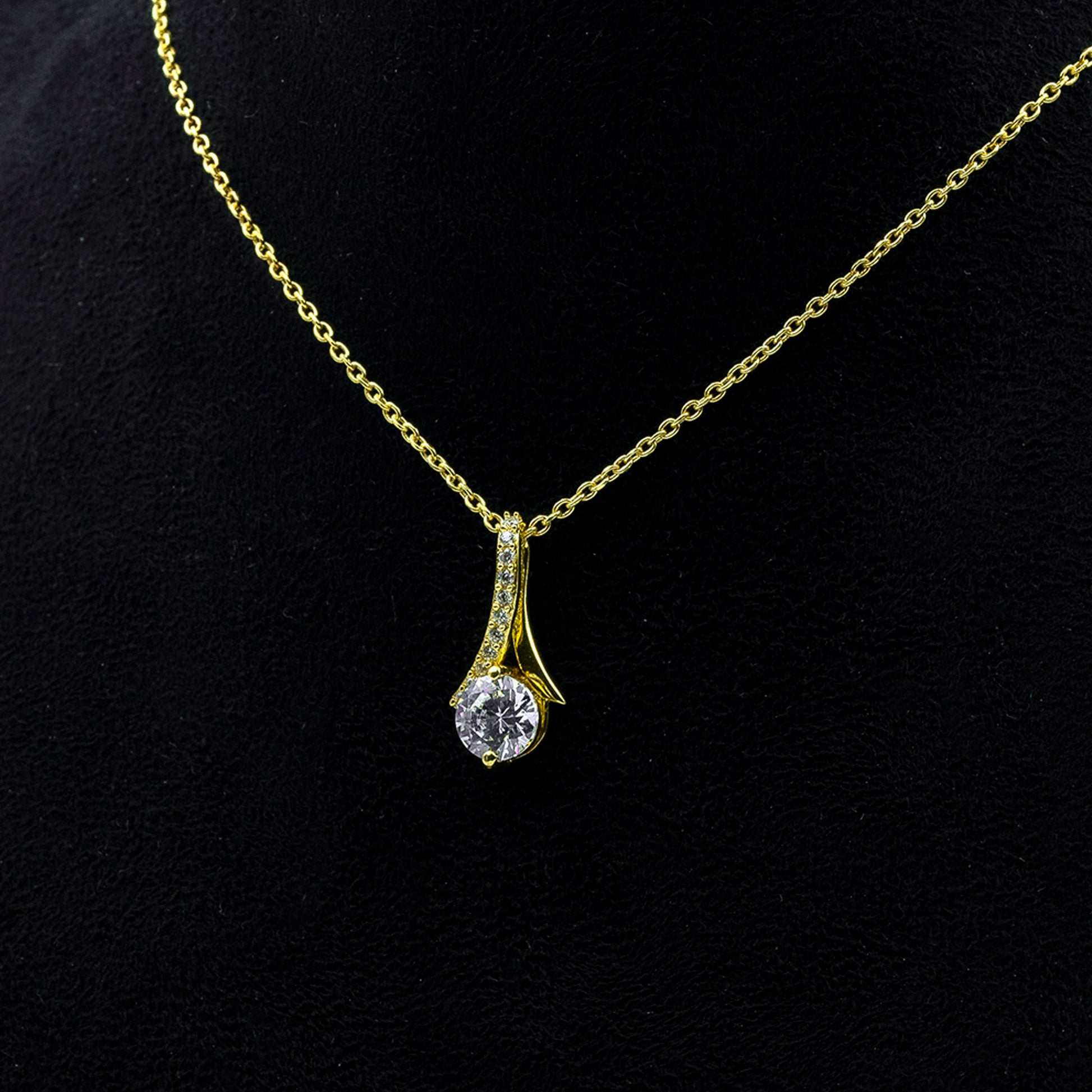 Crafted from 925 sterling silver with 18K gold plating, this graceful drop pendant cradles a sparkling cubic zirconia. Elegant and versatile, perfect for everyday wear or special occasions.