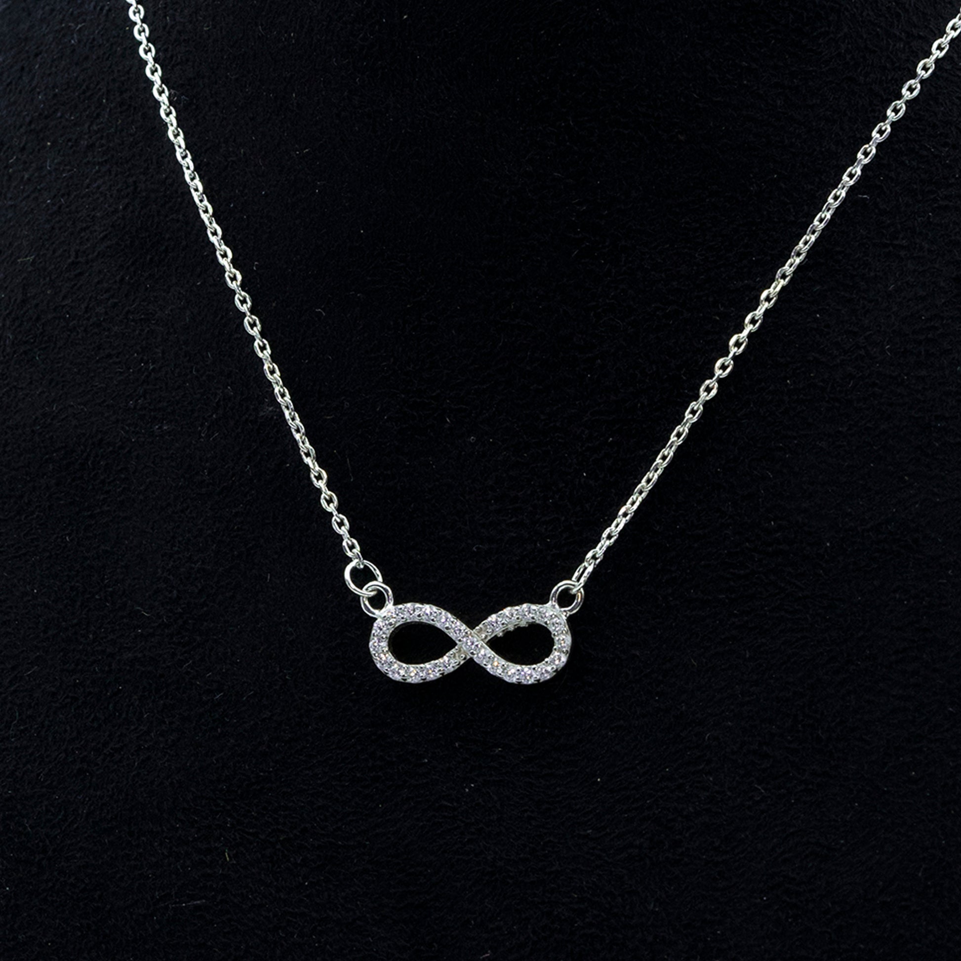 Crafted from 925 sterling silver with rhodium plating, this cubic zirconia infinity pendant symbolizes eternity and empowerment. A versatile, elegant piece, perfect for everyday wear or special occasions.