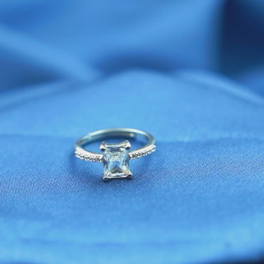 Crafted from 925 sterling silver with rhodium plating, this ring features a dazzling emerald-cut cubic zirconia centerpiece and pavé-set stones for extra shimmer. Tarnish-resistant and elegant, it's perfect as an engagement alternative, statement piece, or everyday luxury accessory.