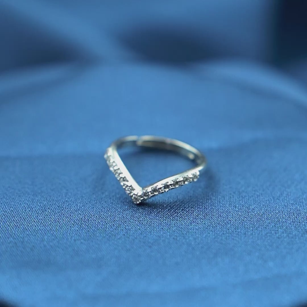 A sleek 925 sterling silver ring with rhodium plating, featuring a minimalist V-shape adorned with shimmering cubic zirconia. Perfect for stacking, enhancing wedding bands, or everyday elegance.